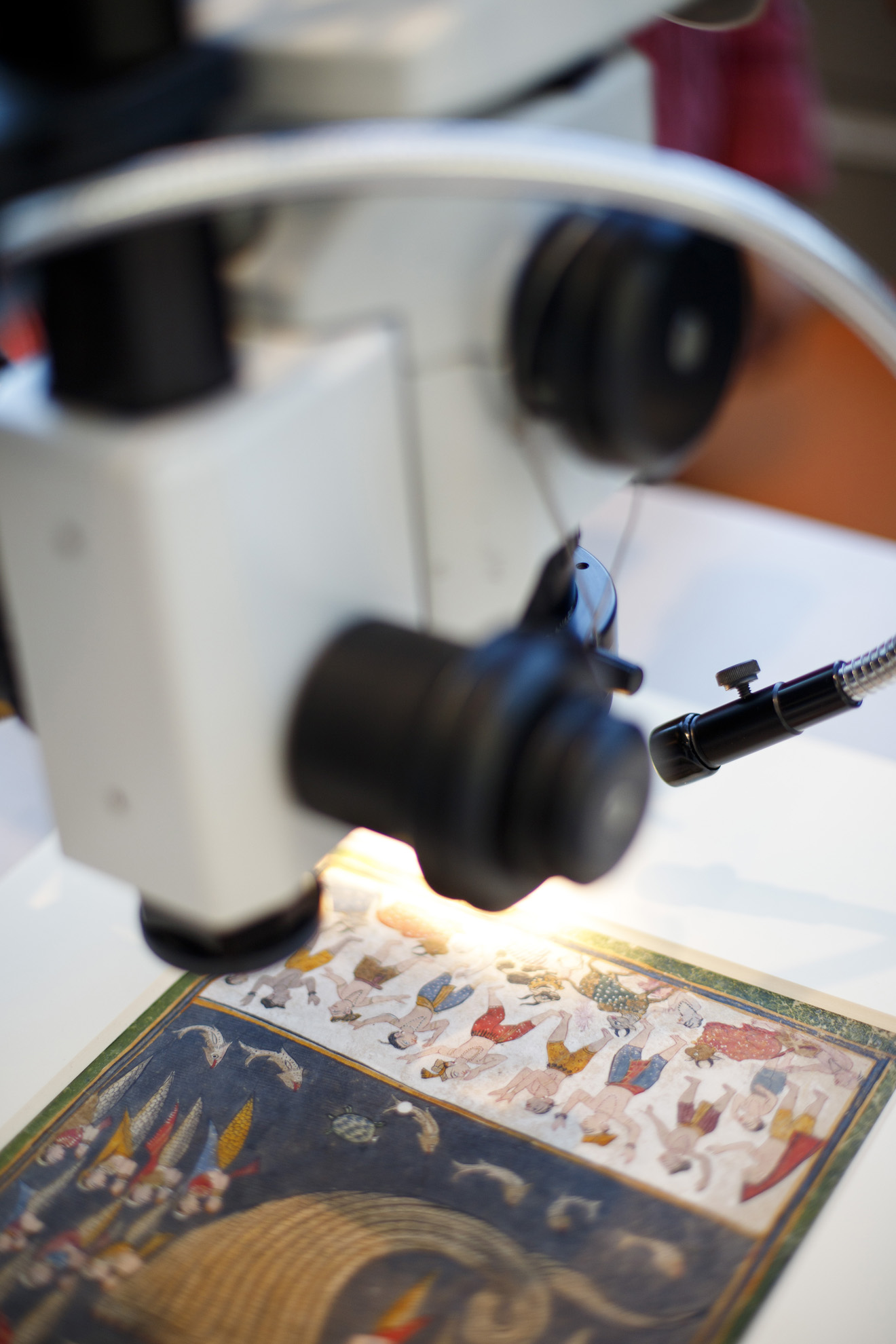 On rare occasions if an artwork is already flaking, it may begin a conversation between conservators, curators, and scientists about whether to take a sample. Eremin used an infrared light technique known as Fourier-Transform Infrared Spectroscopy on one tiny particle taken from a crumbling 16th-century Indian manuscript, and identified that kaolin clay was used for the white border detail.