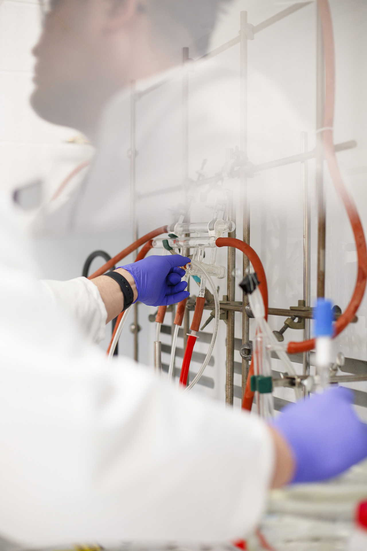 Chenyu Lin, who works on Pérez-Mercader’s research team, adjusts settings on an experiment.