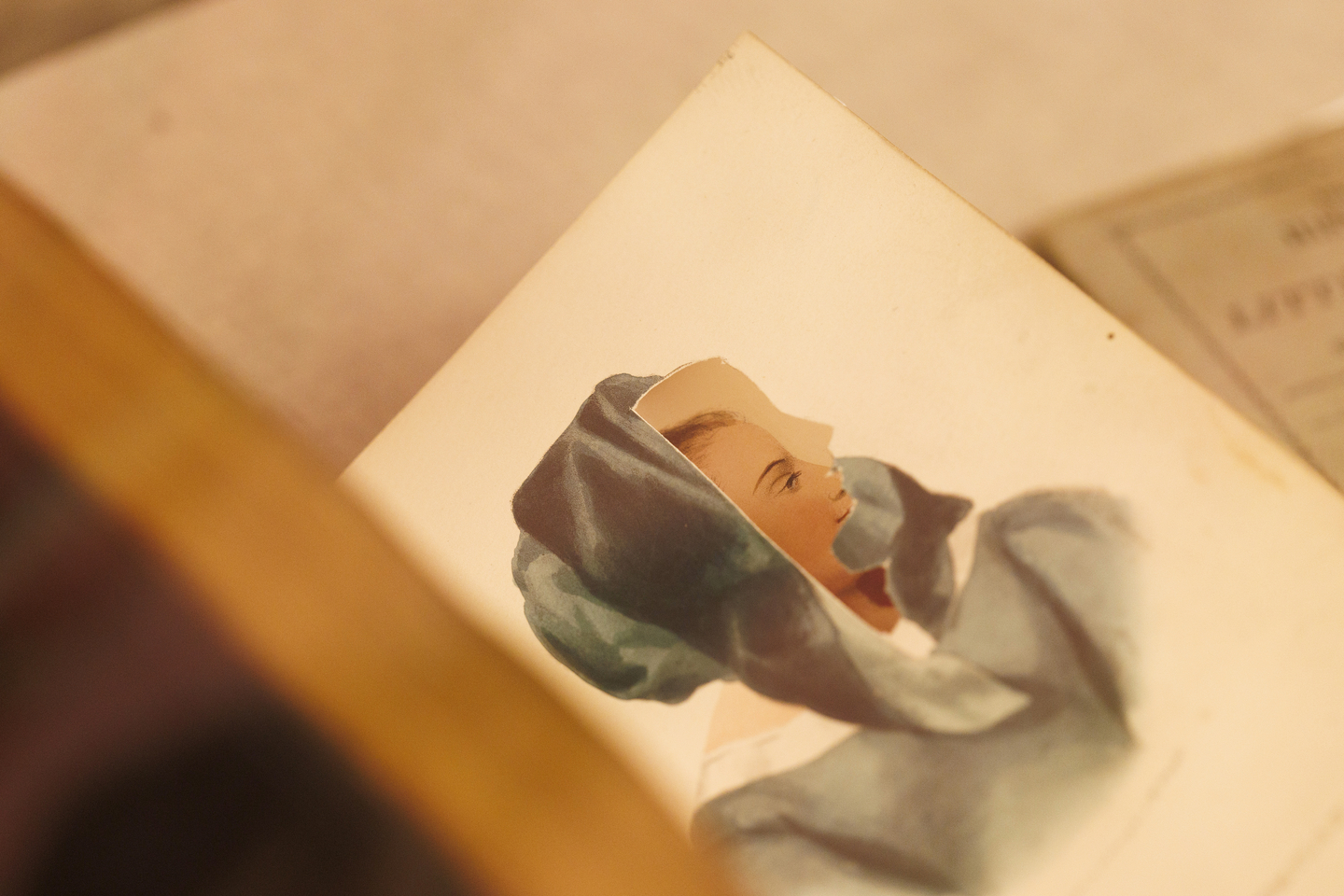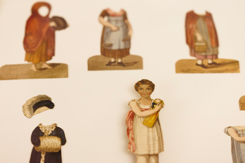 The curators worked with local designer Bella Bennett, who scanned paper dolls from other parts of Houghton Library’s collections and incorporated them into the design for the exhibit.