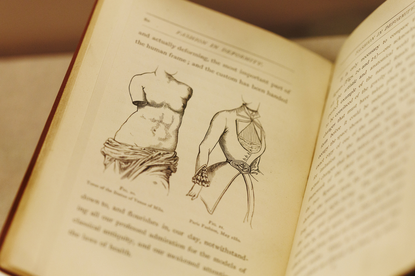 William Henry Flower’s “Fashion in Deformity”— included in the exhibit — makes the case that corsets have a deforming effect on women’s bodies. His book includes illustrations of a woman’s rib cage before and after donning one.