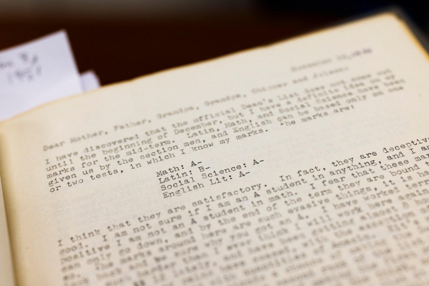 Updike sharing his grades in a letter from November 15, 1950.