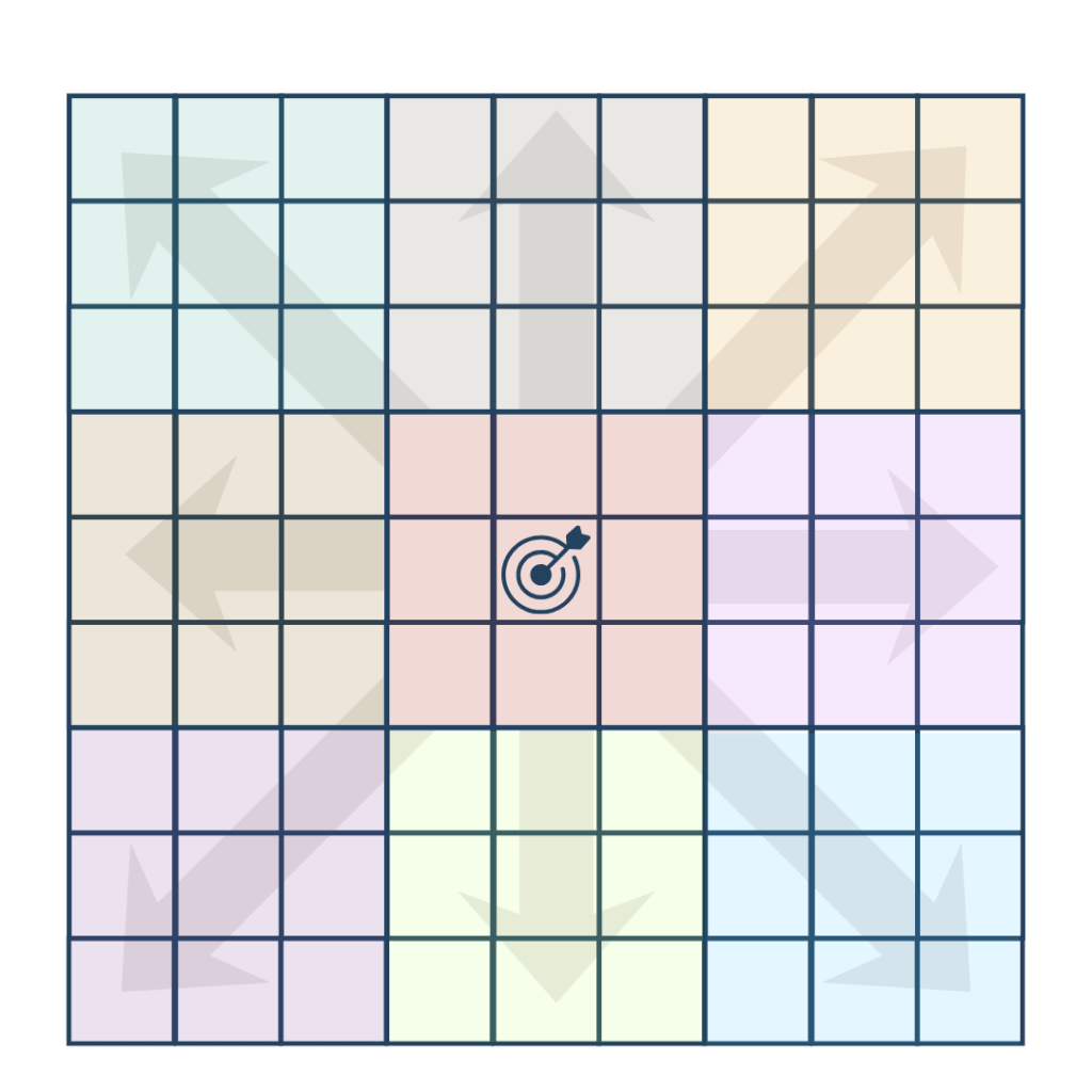 Then the method asks you to do that one thing surrounded by eight, do it again, one more time. So, each of the eight yearly goals — physical conditioning, mental strength, character, karma, etc. — bring those out and surround them by the eight things I have to do on a daily basis to achieve that.