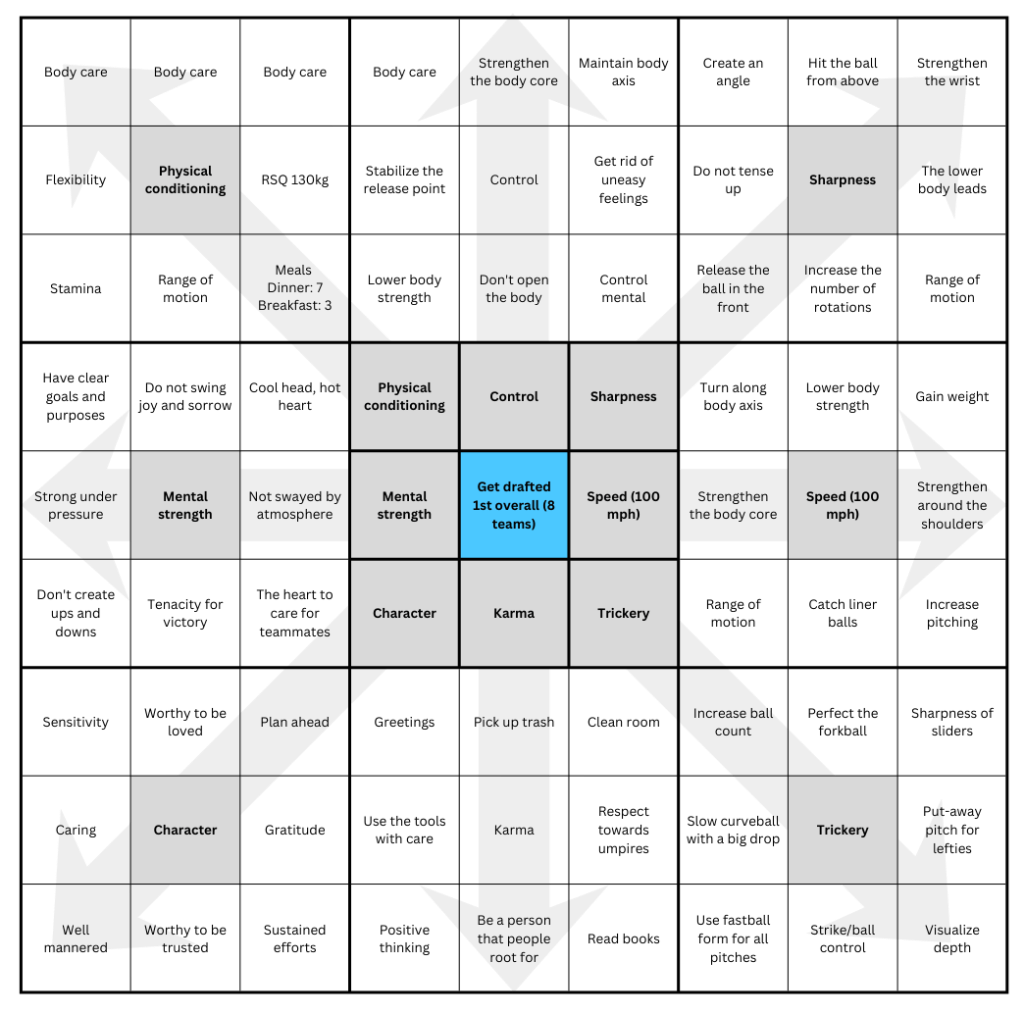 You come up with a multiyear ambition; so really dare to dream. And then, the first step of the chart is, “What are the set of things that if I concentrated on this year, I’d make meaningful progress on my multiyear ambition?” You have one thing in the center: my multiyear ambition. For him, it was “be the No. 1 draft pick” four years later. And then, what are the eight things that if I did this year, I would make progress on my ambition? He had “physical conditioning” and “mental strength” and then four pitching things — “control,” “sharpness,” “speed,” and “trickery.” He had “character” and “karma” for No. 7 and No. 8.