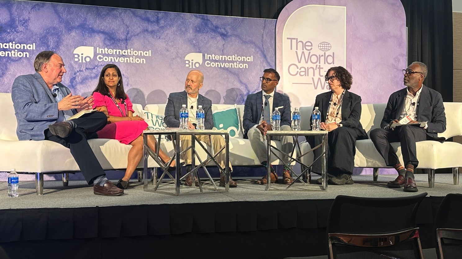 Members of the HGHI Scholarly Working Group, Keith Flaherty (left), Aparna Parikh (second from left), and Clifford Samuel (first from right), at a panel at the BIO Convention in Boston in June 2025.