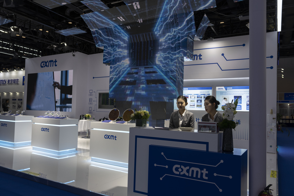Workers at the booth for Chinese DRAM producer ChangXin Memory Technologies wait for visitors at the 21st China International Semiconductor Expo in Beijing, Nov. 20.
