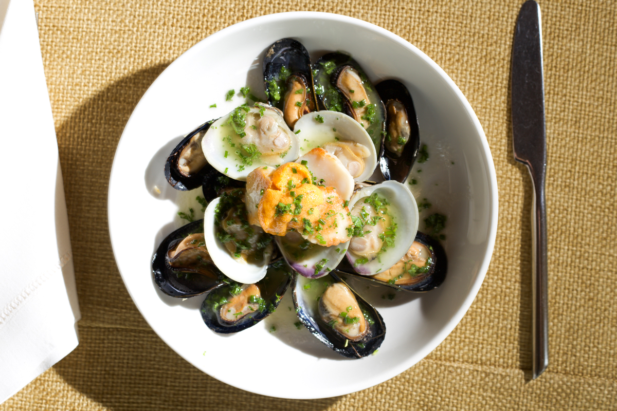 New England Seafood Salad of marinated blue mussels, scallops, clams and sea urchin.