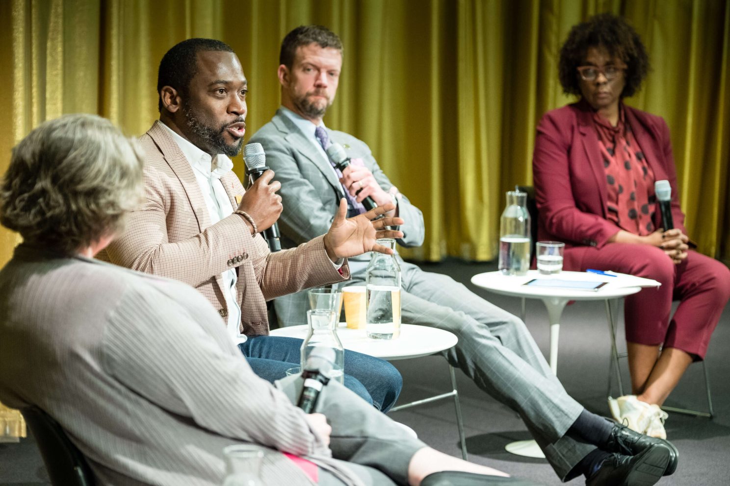 Mayor Levar M. Stoney from Richmond, Virginia, speaks at the Mayors Imagining the Just City event as part of a panel on “Just Cities, Infrastructures, and the College Town.” Photo by Zara Tzanev.