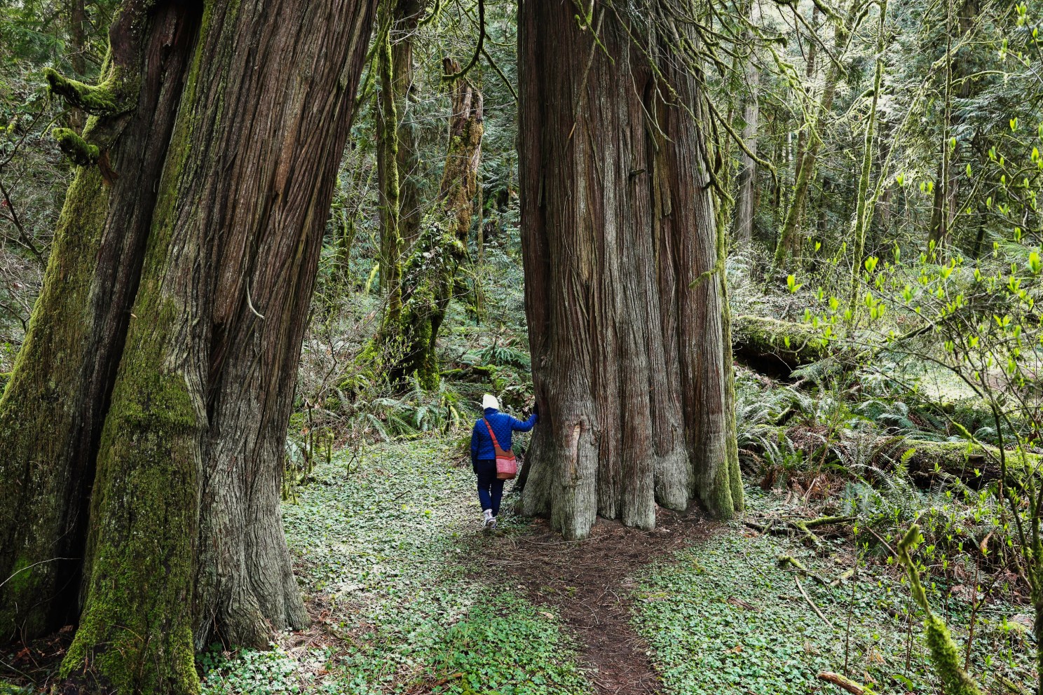 Center for the Study of World Religions Fellow Eugenia Rainey looks more closely at an ancient mother tree, a giant of the forest. This tree is over 1,000 years old and is a valued part of the First Nations culture.