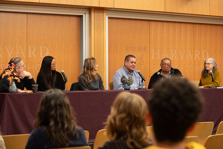 Following the film, Ann Braude, senior lecturer on American Religious History and director of the Women’s Studies in Religion Program at HDS, moderated a discussion among Kassie and four Indigenous scholars: Robert Warrior, Jonah Yellowman, Cynthia Wilson, and Darren Parry.